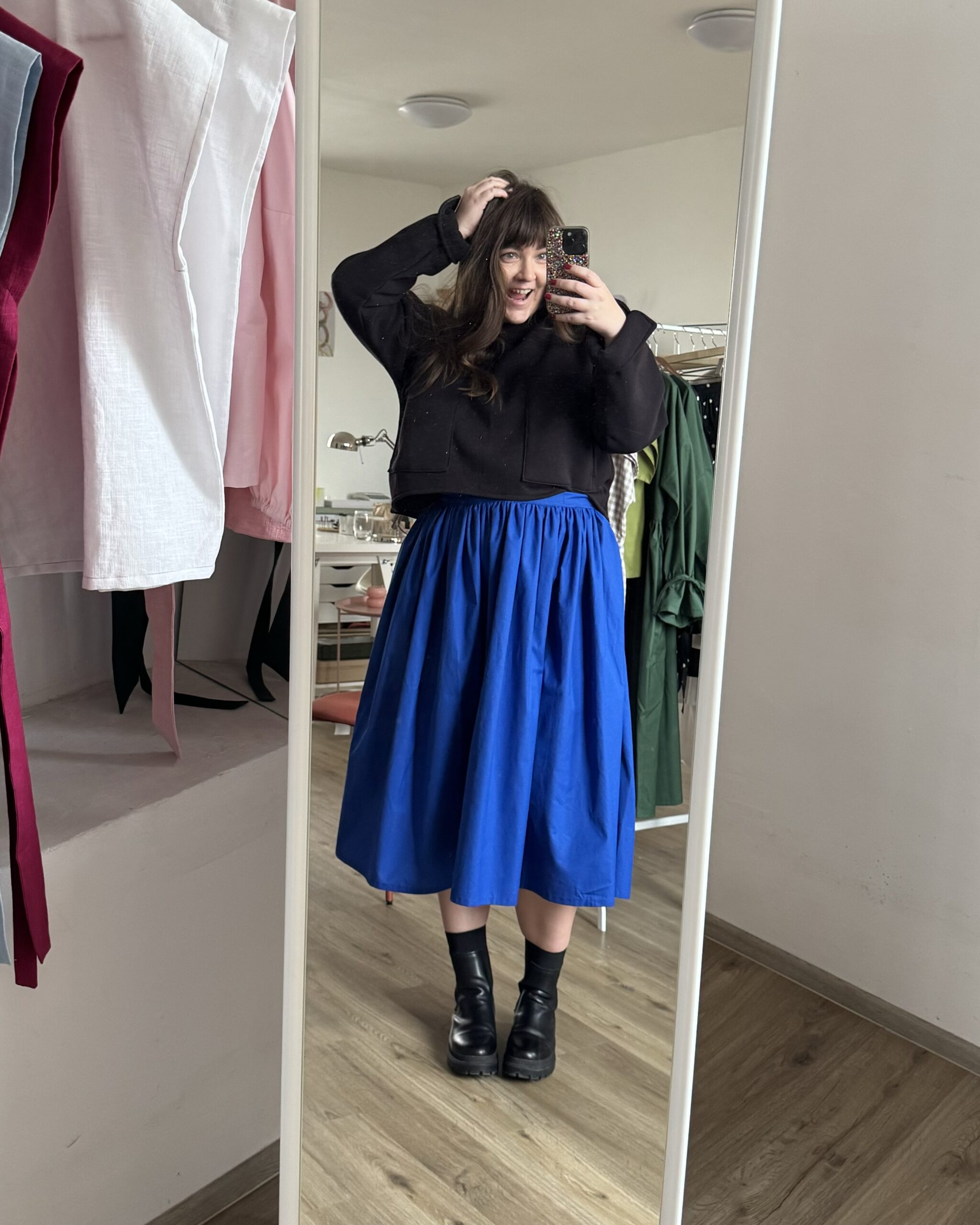 Sukně má univerzální velikost, která sedne na velikosti XS – L. Modelka na fotografiích obvykle nosí velikosti S/M a je vysoká 170 cm.